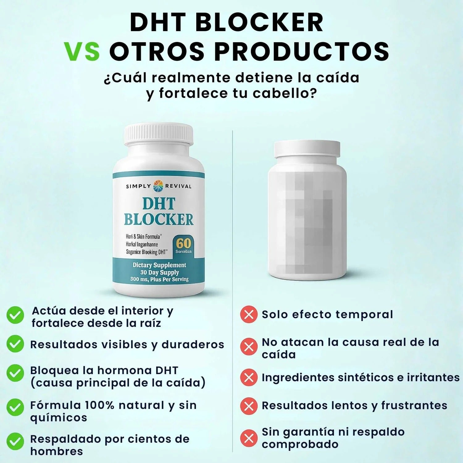 DHT Blocker combina Saw Palmetto, Biotina y Zinc para actuar desde la raíz, neutralizando el exceso de DHT —una de las principales causas del deterioro folicular.